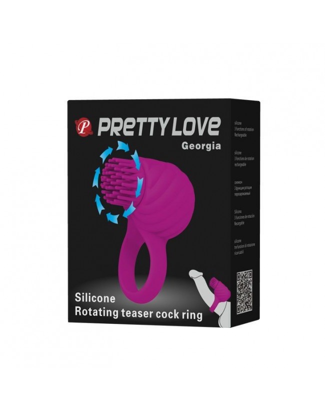 Pretty Love Georgia es un anillo de calidad inigualable, fabricado con la silicona de más alta calidad, se acciona muy fácilmente y además consta de estimulación clitorial rotatoria. Colócalo en tu pene o en tus dedos y gracias a su silicona resistente y de gran calidad, se ajustará perfectamente mientras la rotación estimula el clítoris de tu pareja.