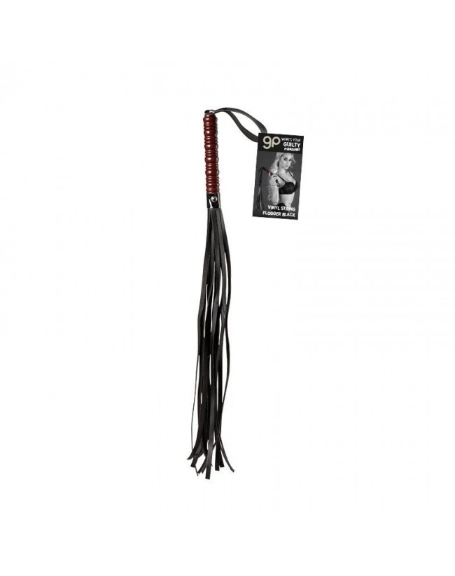Látigo Flogger de símil de piel (vinilo) con mango rígido marrón y correa para la muñeca.