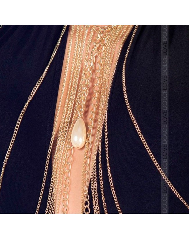 Un collar exquisito para el cuerpo, dorado, con cadenas de diferentes tamaños, que se unen junto al pecho al alrededor de una lágrima de perla. Tiene cierre ajustable en la parte posterior. Una idea original para embellecer un vestido o destacar el cuerpo con clase y elegancia.